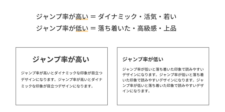 例えば、文字や画像の大きさの比率が大きい場合には「ジャンプ率が高い」、比率が低ければ「ジャンプ率が低い」と言った表現をします。