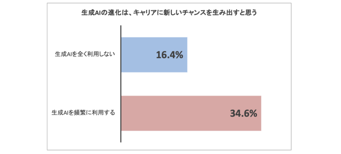 AI利用の効果(Q1×Q10):一方で、AIを頻繁に利用している人(217人)*2のうち、生成AIの進化は今後のキャリアに「新しいチャンスを生み出すと思う(希望)」と回答した人の割合は34.6%で、全く利用していない未経験者(16.4%)の約2.1倍と、大きな差がつきました。