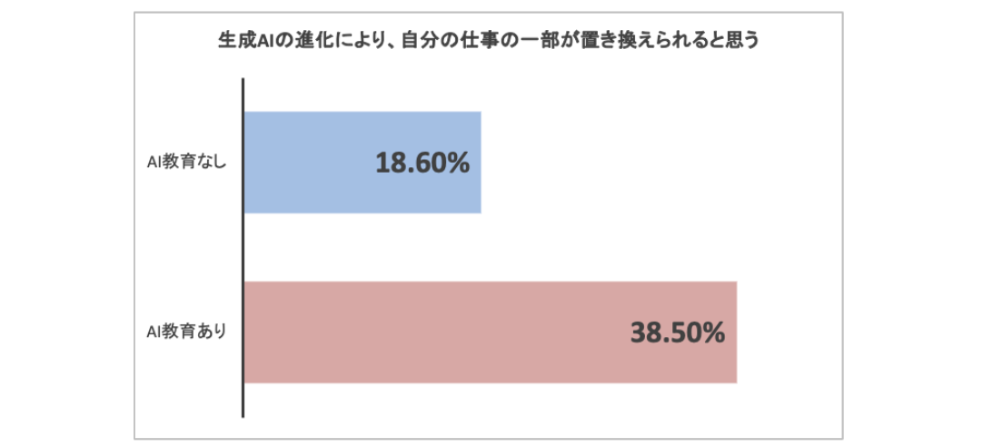 AI教育の効果(Q8×Q10):「AI活用に関する十分な教育やトレーニングを提供」している会社の人(143人)*1のうち、生成AIの進化により「自分の仕事の一部が置き換えられると思う(不安)」と回答した人の割合は38.5%で、非提供会社の社員(18.6%)よりも19.9ポイントも不安が増幅するという、逆説的な結果となりました。形式的な情報提供や内容・レベルが個人の理解度に合わない教育だけでは、不安が煽られ逆効果となっている可能性があります。