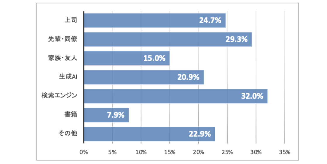 - 生成AIは協働者に?生成AIの利用領域が変化: 仕事で知識や情報不足に直面した際に「最初に頼るもの」として、「生成AI」(21%)が「上司」(25%)に迫る水準に。また、AIの利用領域は、定型業務(20%)だけでなく、専門的な問題解決(19%)やアイデア出し(13%)といった高度な業務にも拡大。